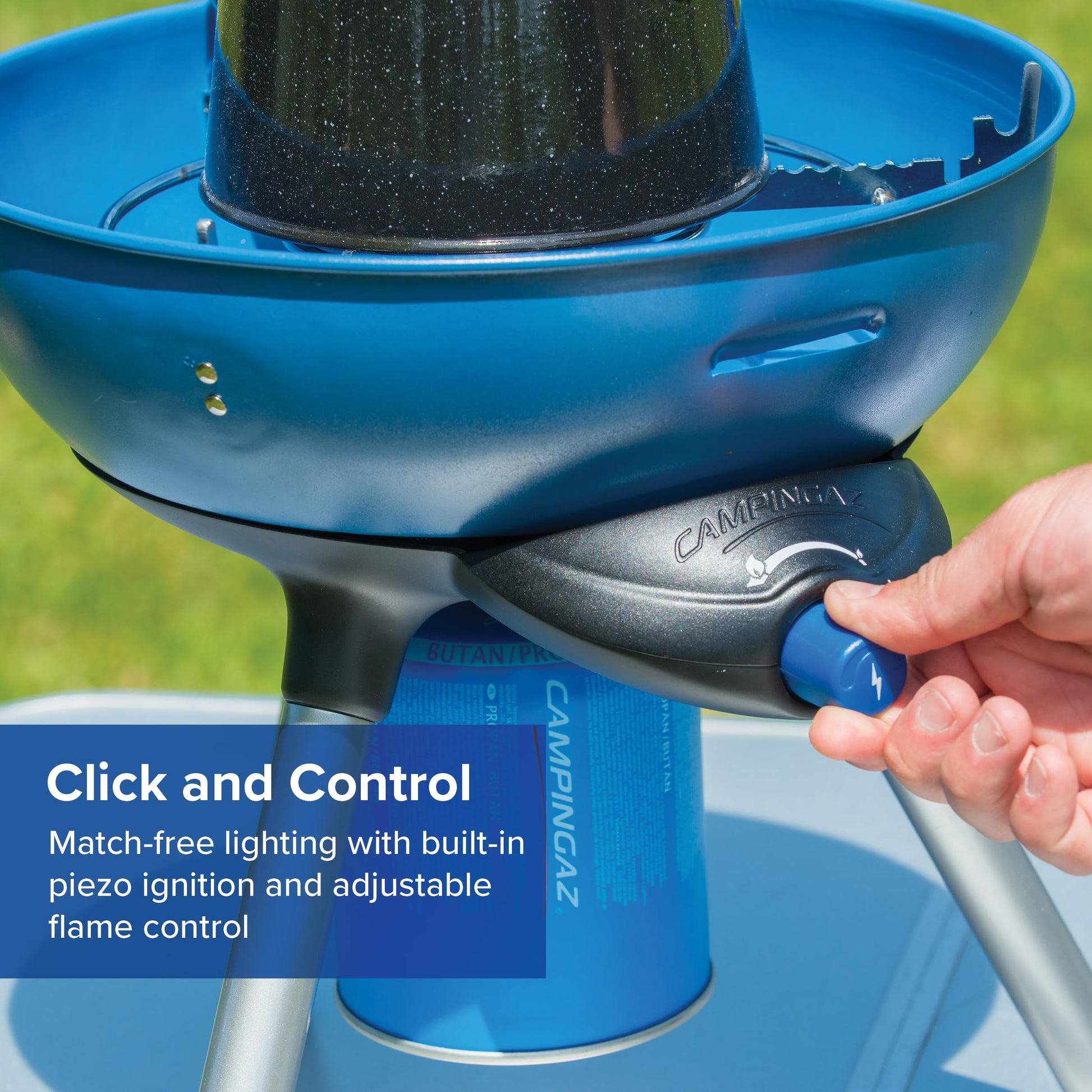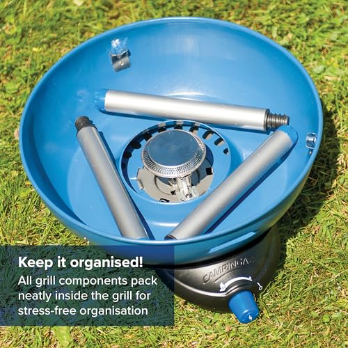 - Potente potencia: la mini parrilla de 2000 W funciona con el cartucho de gas Campingaz CV 470 Plus (tiempo de combustión de hasta 3 horas); encendido seguro en cualquier condición meteorológica gracias al encendido piezoeléctrico