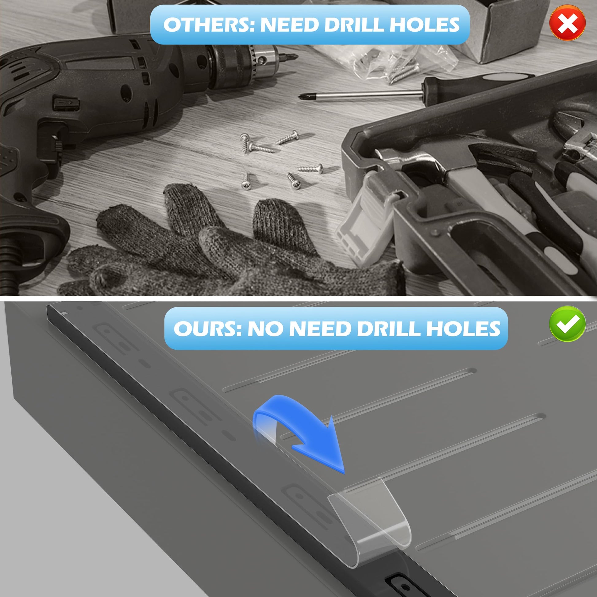 Gracias a su sistema de deslizamiento suave y silencioso, acceder a tus utensilios, productos de limpieza o alimentos almacenados será más cómodo que nunca. Además, su instalación es rápida y sencilla: no requiere taladros ni tornillos, ya que se fijan fácilmente mediante cintas adhesivas de alta resistencia 3M incluidas.