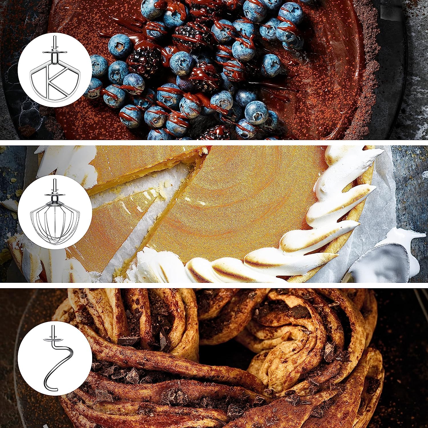 - PARA BATIR Y AMASAR: incluye un gancho de amasar, varillas para batir y mezclador con forma K para realizar cualquier receta de pastelería o panadería