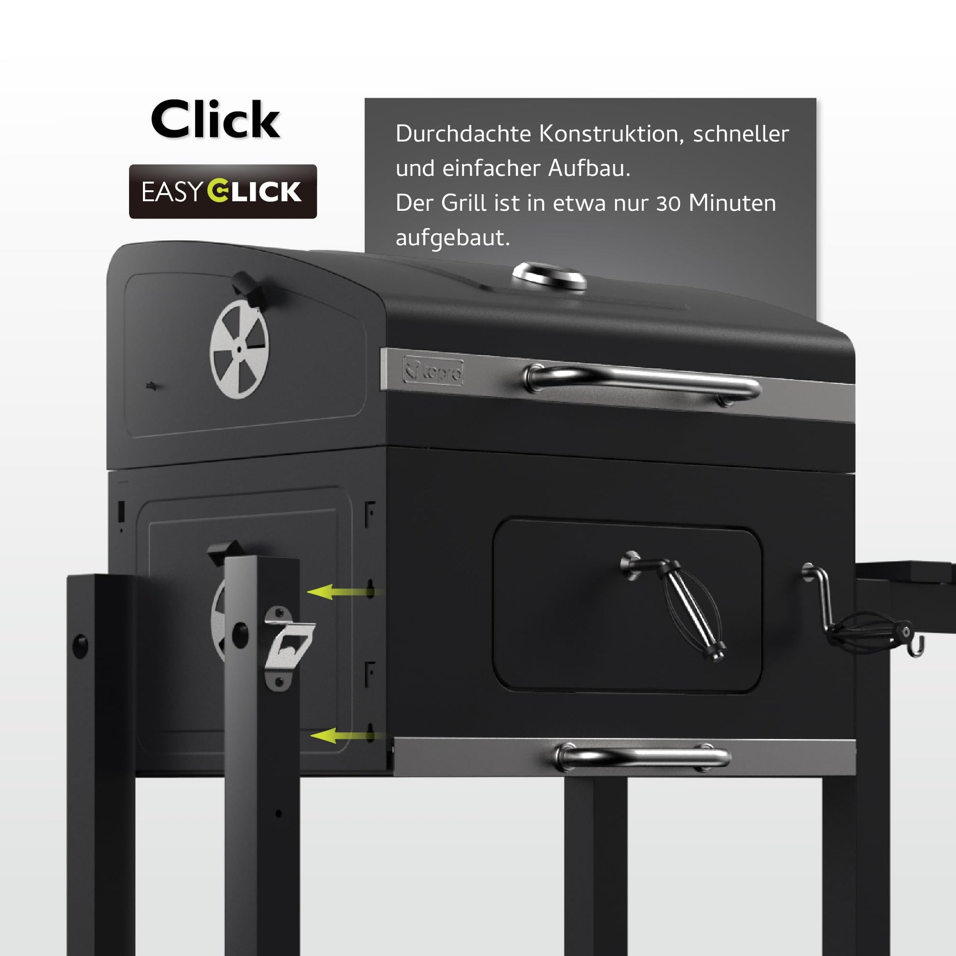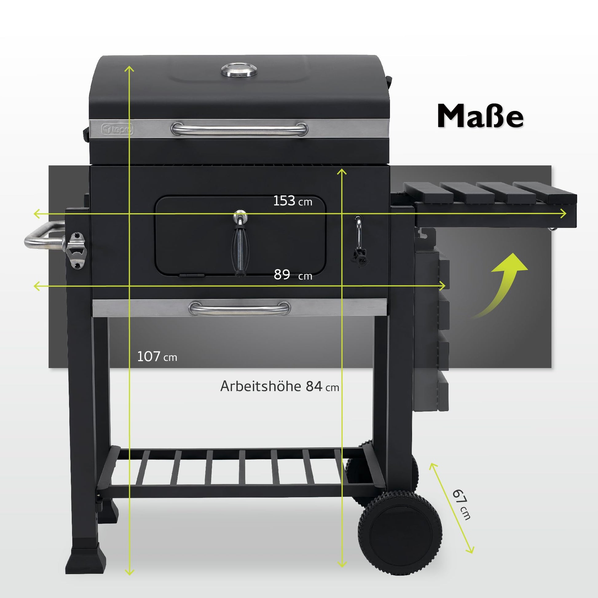 - Nota: la tapa fácil de manejar también te permite asar alimentos en el espacio cerrado, en lugar de colocarlos directamente sobre el carbón encendido. La chimenea garantiza que el «Toronto XXL» también sea perfecto para ahumar alimentos.