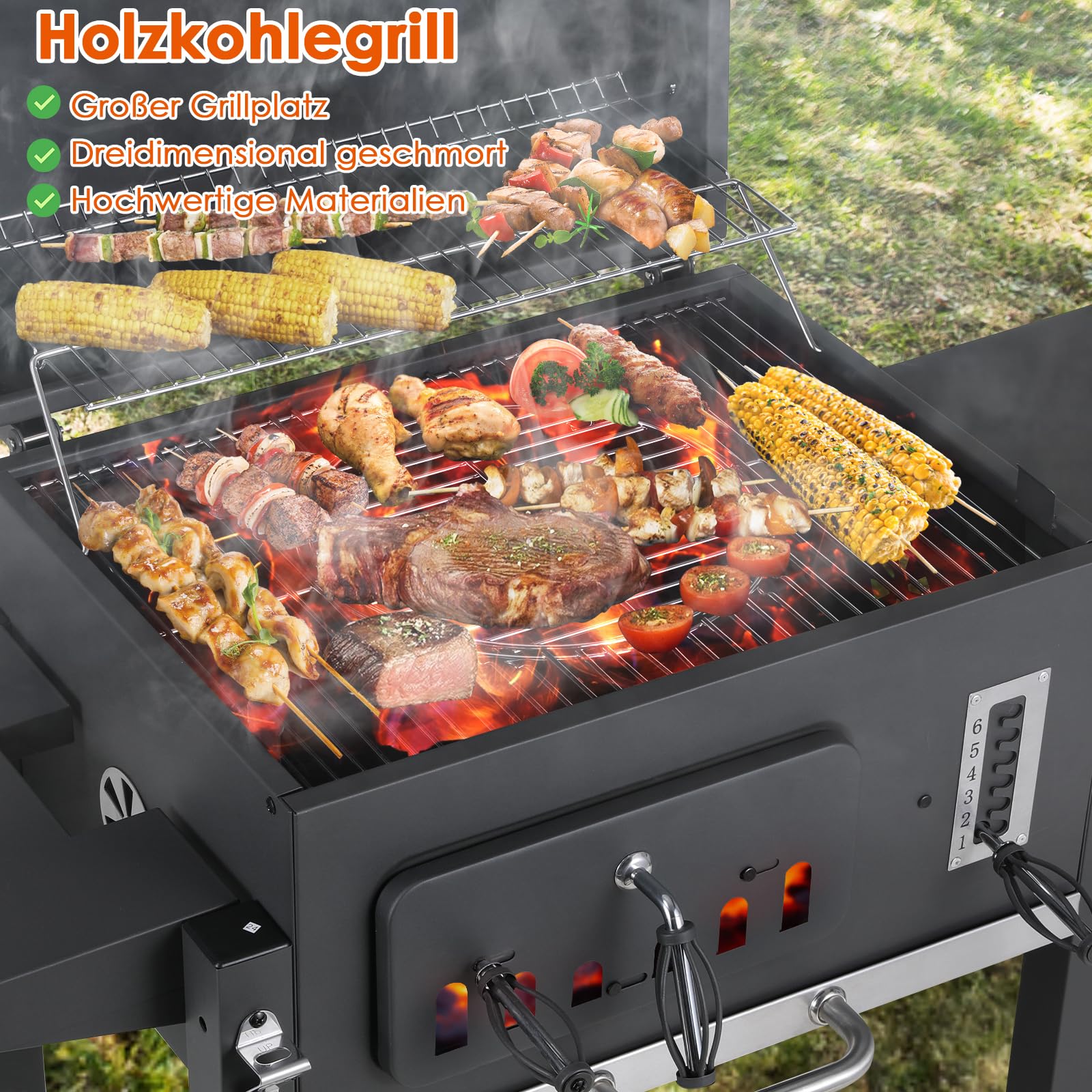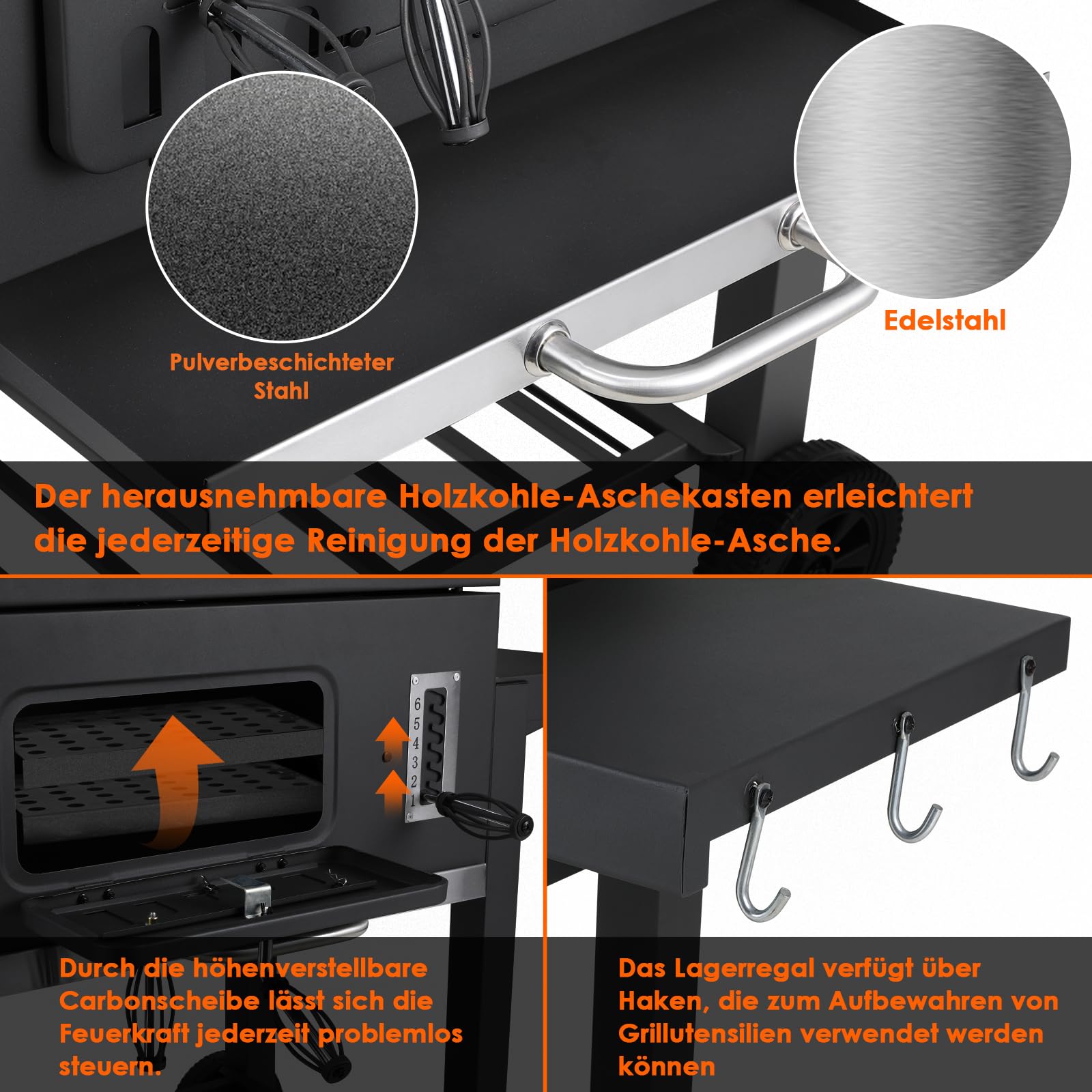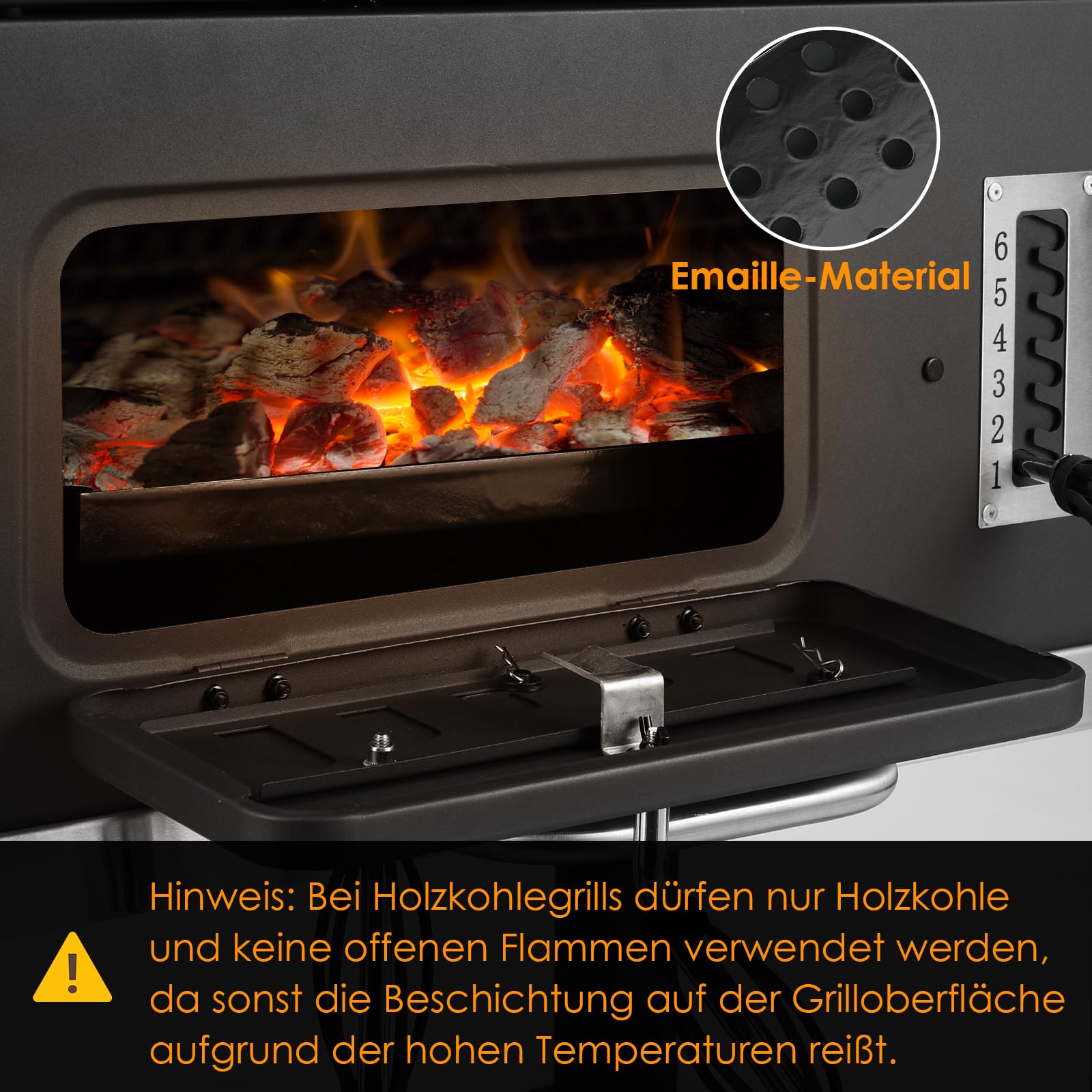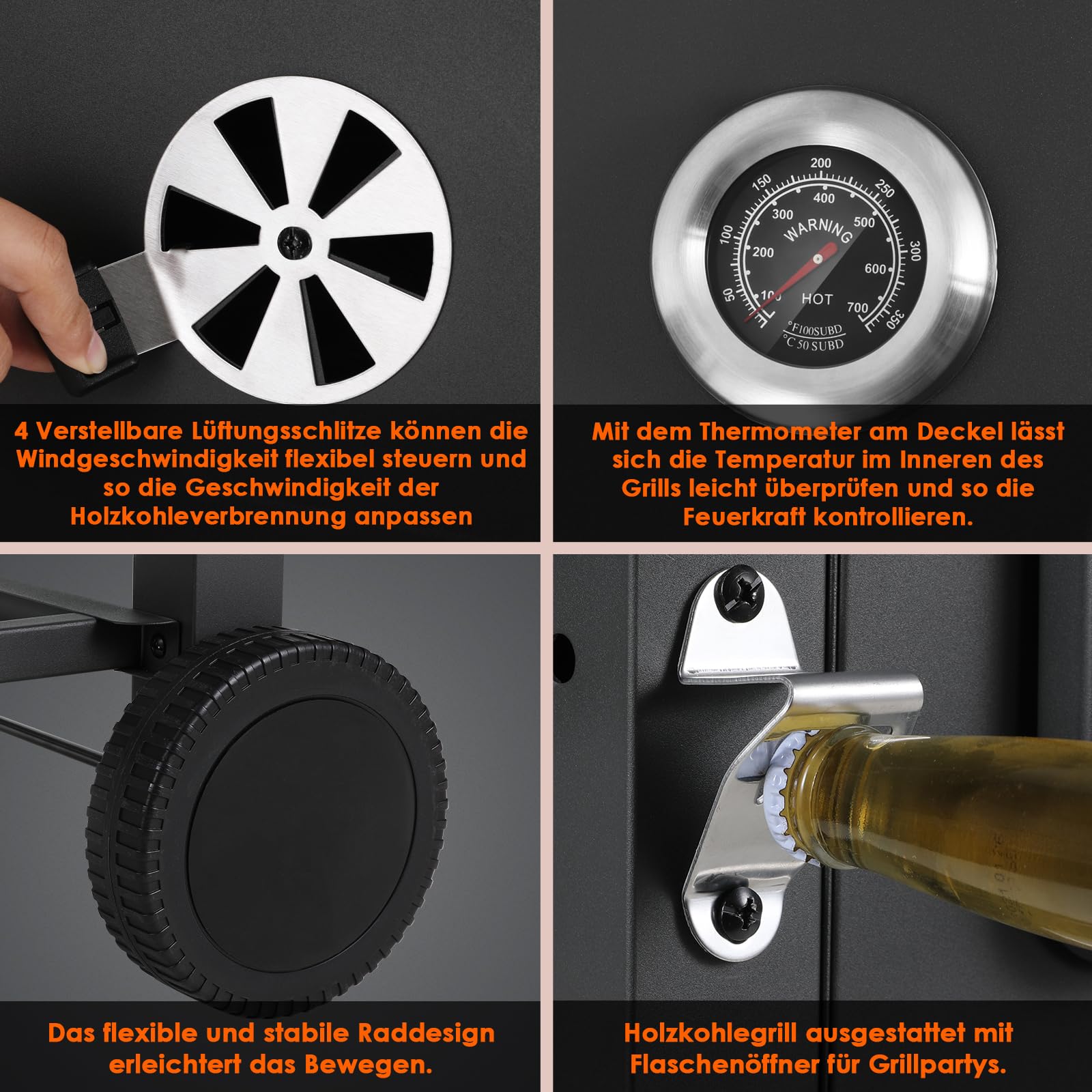- 🔥Movilidad flexible: La barbacoa carbon con ruedas se puede mover rápidamente y la parte inferior está equipada con una caja de cenizas de carbón independiente, que puede aislar eficazmente el calor, y es conveniente tirar del mango de acero inoxidable en cualquier momento para limpiar el hollín. La puerta de carbón facilita agregar carbón y ajustar la potencia de fuego. Además, la parrilla está equipada con 4 ranuras de ventilación ajustables para un suministro de aire óptimo.