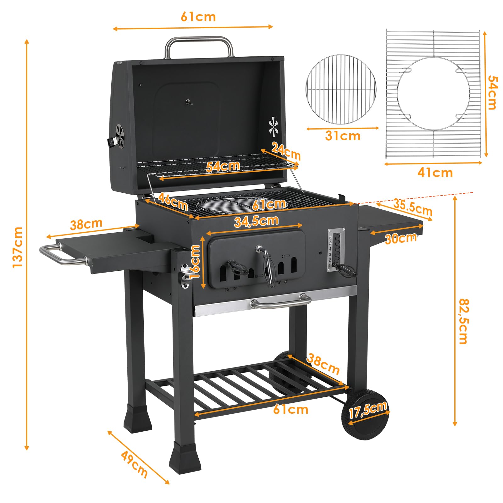 - 🔥Parrilla multifuncional: la barbacoa de carbon con tapa tiene una gran área de parrilla. El tamaño del área de parrilla inferior es de 54 x 41 cm, el tamaño de la parrilla redonda extraíble en el medio es de Φ 31 cm y el área de la rejilla de calentamiento superior es de 54 x 24 cm. La parrilla de carbón puede lograr una función de estofado tridimensional para garantizar la delicia de los ingredientes, ideal para asar o ahumar alimentos.